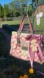 monogram print, colorful, metallic hardware, teddy bear charm, pink bow, scribble design, casual tote, playful accessory, durable fabric, vintage-inspired