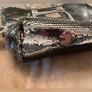 Taken care of, hardly used, no spots in the inside it’s just reflection of the shiny sequins. Close up of inside with the coach label shows no spots. can provide more info and pics upon request.