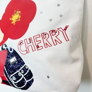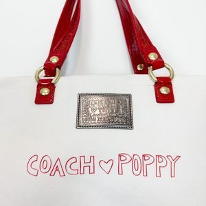 Peep this super cute Cherry Poppy Chan Evie tote from Coach! Featuring adorable Cherry-Chan, this ivory canvas bodied tote is to die for. Rare and limited edition. Sequins galore cover kawaii girl Cherry’s backpack and are subtly placed to add a little glitz! Sparkle glitter double handles. Coach hang tags. Coach Poppy patch on the back in silver. Bright red! Perfect for spring and summer. Large and in charge tote stores all your essentials! Gorgeous bright red satin lining. Interior hook closure.