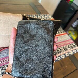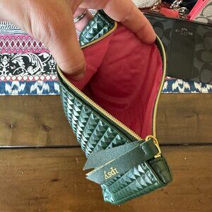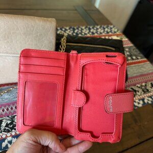 Coach pouch is missing zipper pull and logo is faded. Unsure what phone fits in the Coach case, but measures 12cm x 6cm. Express clutch is in good shape, so is the Ipsy green pouch. Crossbody has peeling and scratching, but could use the detachable chain for for something else.