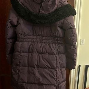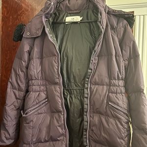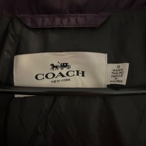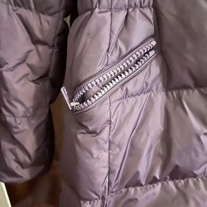 Beautiful deep purple down coat from Coach. Very warm, has good sized pockets, detachable hood with a fuzzy black trim. Small stain on the back towards the hem, not very noticeable when worn. Size on tag is medium, would probably fit a small, medium or large well.