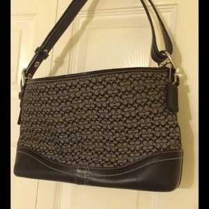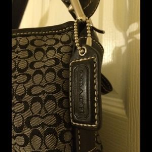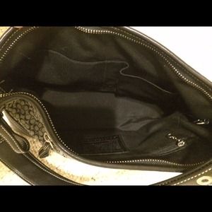 This item is a Coach purse in great condition with a black leather bottom, trim and handle. The body of the purse has the signature Coach logo pattern in black and light tan. The exterior has one enclosed pocket with a leather handled zipper. The interior of the purse has two open pockets and one zip enclosure pocket. The purse has a zipper at the top to enclose the entire purse and has a buckle on the sides of the handles to adjust the straps.