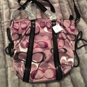 Brand new with tags coach purse! Extremely adorable and sporty yet classy! Mauve color. Straps down front of back do have black glitter down them and will come in original coach bag. first picture is without flash the rest have flash. I DO CONSIDER OFFERS