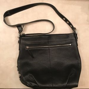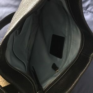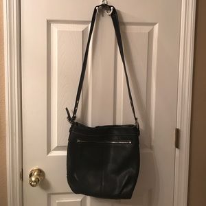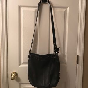 Black Leather Coach Purse with an adjustable strap and a light blue interior. Excellent condition. Body of the Purse is approximately 13.5 inches wide x 11.5 inches high. Great bag with an additional zipped pocket on the outside as well as two open pockets and an additional zipped pocket on the inside.