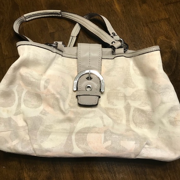 Beautiful coach purse. I absolutely love this purse, I just don’t ever use it anymore due to preferring crossbody purses at the moment. This light toned tan and pastel pink pairs perfectly with just about any outfit during any season. Normal wear for a purse but other then that in really good condition.