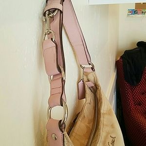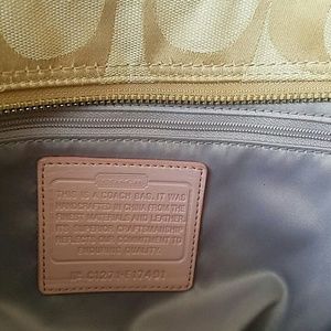 Tan with pink leather Coach Purse.. Has normal wear and tear it's more on the newer side. Measures about 14''long x 8'' wide 100% Original