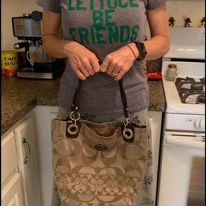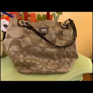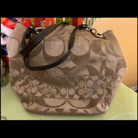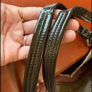 In pretty good condition! Patent leather on the straps. I loved this purse but need a closet clean out! There is a mark or two on the bottom that can be removed and is reflected in the price. Make me an offer!