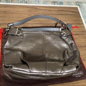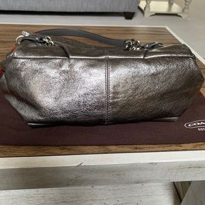 Coach Shoulder Bag in beautiful Gun Metal color. rarely used a couple corners have some wear as shown in pictures but isn’t noticeable. Real Showstopper.