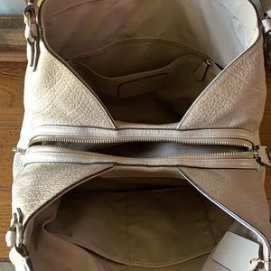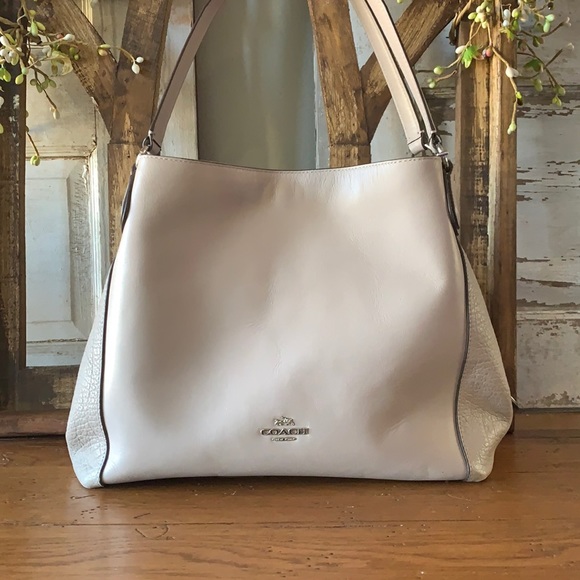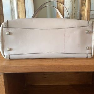 Used Coach smooth leather Shoulder Bag in the color Oyster. Water marks on bottom, can be seen in second picture.
