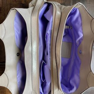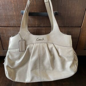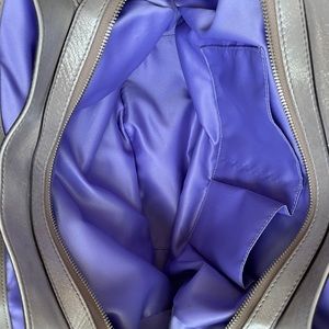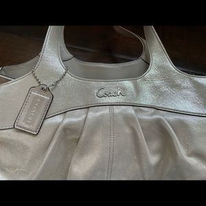Coach metallic leather hobo handbag. Very soft to the touch. 3 compartments. Middle one has a zipper. The 2 outside compartments have a snap close. The inside is a beautiful purple color. 15” W x 10” W x 6” D. Handle drop is 9”. Bought from a Coach store. Excellent condition.