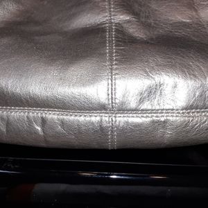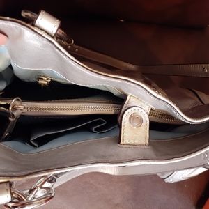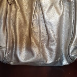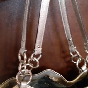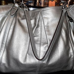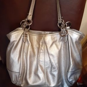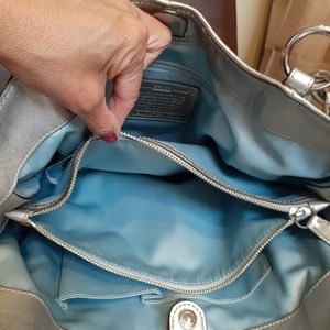 Women's Coach Purse, leather, silver color, inside tiffany blue pockets, center zipper pouch, shoulder straps with silver rings, in excellent condition,like new. Measures about 15"in. Wide x 12"in. top to bottom, shoulder straps 8"in. long.