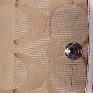 cute beige coach purse! worn over the shoulder and pairs well with any outfit! comes with a cute blue flower Keychain. I used it a lot but it is clean and in good condition. smoke free home!