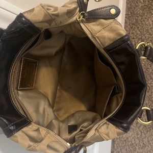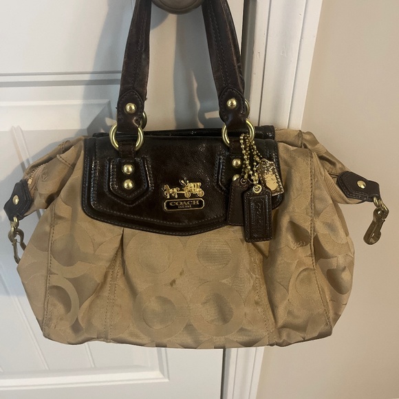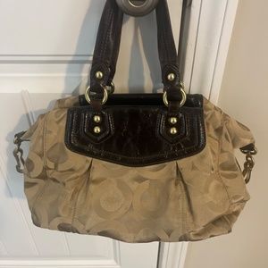 Taupe and brown Coach purse. Flaws pictured. Used condition. Gold/taupe interior.
