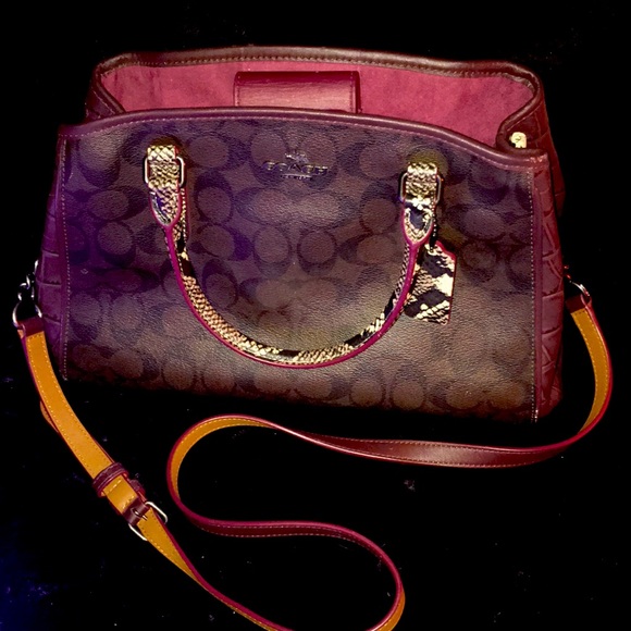 This Signature Exotic Small Margo carryall in the signature coated canvas and exotic embossed leather (Coach F38380) Oxblood suede insides and antique nickel hardware. Has a magnetic closure with a center zipper compartment, along with several side pockets for things like a cell phone or keys. This purse will be the envy of all your friends for half the price! Purse is 10 inches tall X 12 inches long (at the mid point) X 6 inches wide. Comes with a removable crossbody strap that gives you a 20 inch drop (strap is about 44 inches long at its current setting but can be made longer or shorter)
