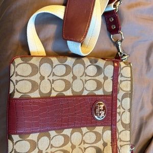 Beige and brown background with red leather detailing. Red interior. Exterior pocket on each side. Center zip pocket. Shoulder strap.