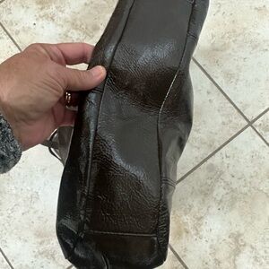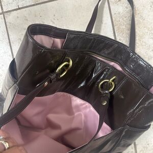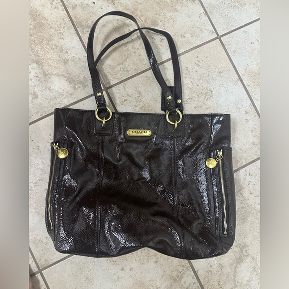 Brown Coach Purse with gold trim. Like New condition. I purchased for myself and never used it. I thought I would like the style but couldn’t get use to the shiny material.