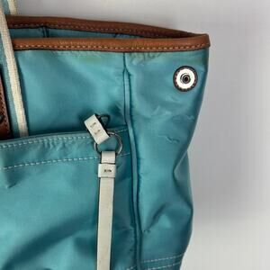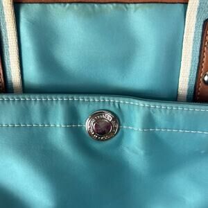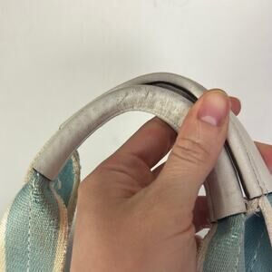 Used Coach Purse. I’d consider it to be a satchel, but I’m not a purse expert by any means. Light blue satin like exterior. White and silver and leather accents. Listed as used due to some exterior wear and stains. This is from 1998 per the Coach serial inside. The inside is in super good shape. Cute spring purse!