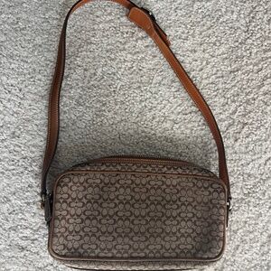In good condition this brown coach purse measuring 4" high and 8 1/2" long. Strap is 12 " from purse to top. Great purse easy to carry with ample storage inside. Exterior zipper pocket and an inside additional pocket.