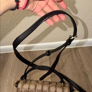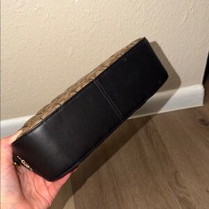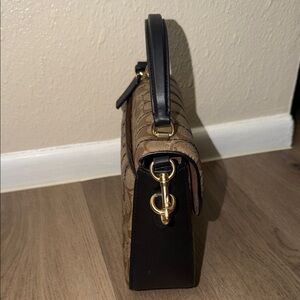 Stylish Coach shoulder bag with signature pattern. Features tan and black design. Gold-tone hardware adds elegance.