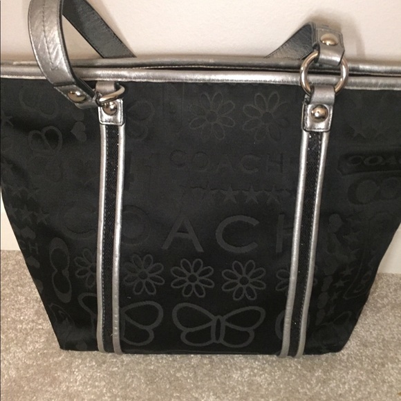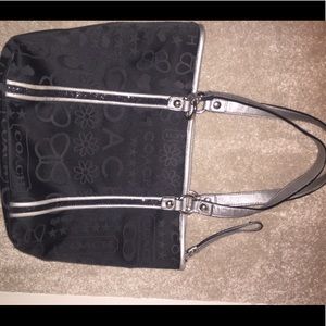 Coach purse!Black monogrammed with silver details/straps. Rich blue interior. Gently used.