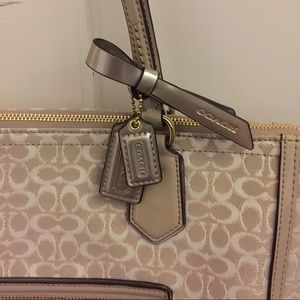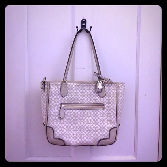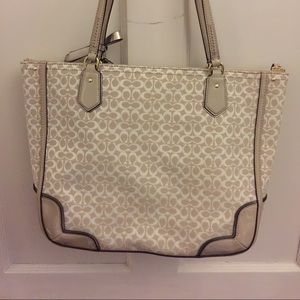 Authentic Coach tote, used once. Like brand new. Light purple interior, beige, signature "c" tote with leather trim! Bought at Macy's.