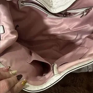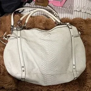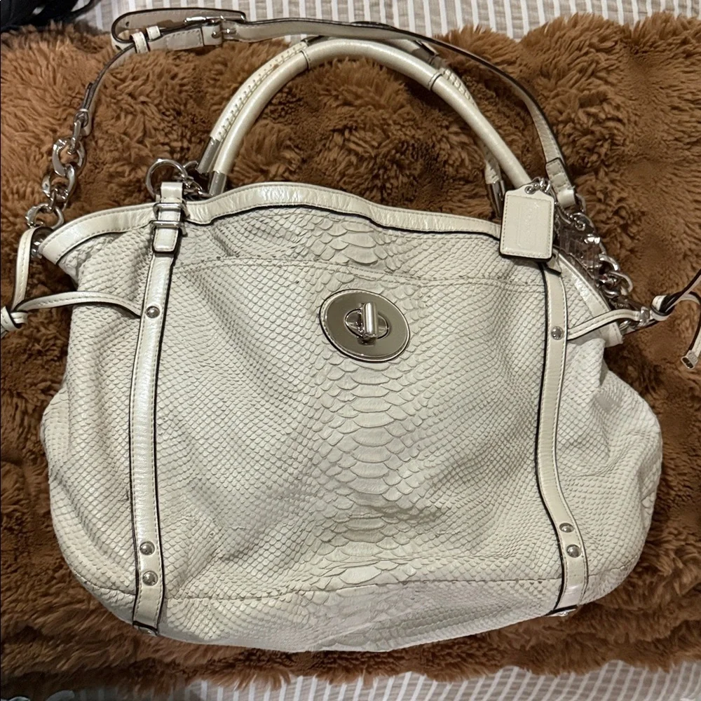 This elegant cream handbag is perfect for any occasion. Its stylish design and versatile color make it a must-have accessory. Snake/python Coach handbag good condition.