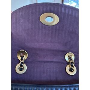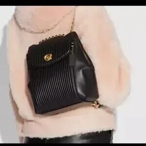 Coach quilted leather backpack in black with gold turnlock closure and chain detail. Smooth leather sides, structured shape, and comfortable straps. Clean interior and exterior. A chic backpack for everyday wear with a modern quilted finish. Larger size: (approx. 11" H × 11" W) of bag itself.