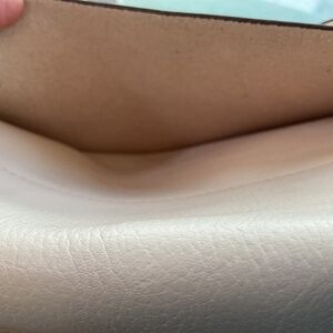 Here is an authentic limited edition Coach Keith Harding unlined saddle bag in EUC! It is in a cream pebbled leather with a matching leather adjustable crossbody strap. Classic saddle styling with orange “LOVE” lettering in smooth leather by Keith Harding on the front. It opens with a snap closure that is pulled underneath by a leather tab. It is unlined with a zippered pocket. The leather coach label on the zippered pocket identifies the Coach bag number for authentication. The bag measures: Height: 8.5”, Width 9.5” and Depth: 2’. There is a slight scratch in the interior suede under the flap (see photos), stain on interior zippered pocket exterior (see photos) and a slight diagonal crease on the back of the bag (see photos) and some slight creasing on the bottom right front of the bag (see photo). Have not attempted to remove stain on interior pocket but looks like it can be cleaned up or lightened easily as it is fabric. The bag includes a leather Keith Harding hang tag in matching cream leather. This is a beautiful Coach crossbody that has barely been used! Perfect for the spring and summer fun and ready to ship out quickly!