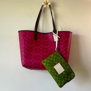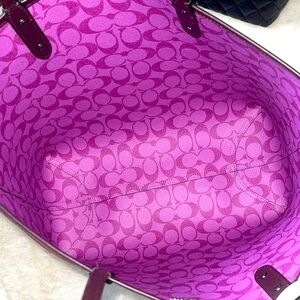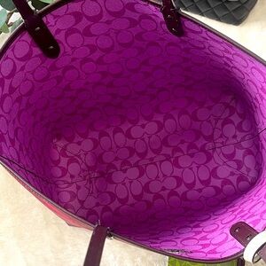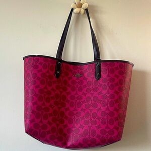 Elegant Coach tote with iconic pattern. Deep maroon shade. Ideal for everyday use.