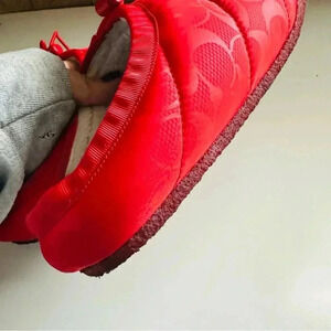 A puffer for your feet, this cozy warm slipper is printed with our Signature and lined in plush faux shearling. The indoor/outdoor slip-on style features a drawstring toggle stop closure and flexible non-slip rubber sole.