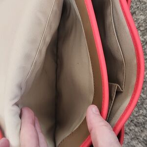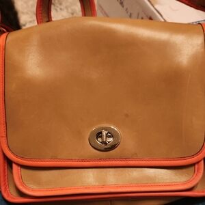 Coach Rambler saddle bag from the archive collection. Tan and coral crossbody bag is perfect for any occasion. Its chic design and vibrant colors make it a must-have accessory.