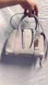 Clay/chalk/light gray flexible pebbled leather, light purple leather trim.