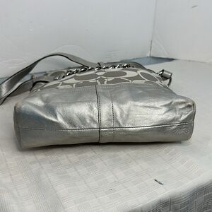 Coach Like New Condition Gorgeous and RARE crossbody bag shoulder bag handbag Purse Signature C pattern fabric in Silver/ shine Metallic silver genuine leather Trim & strap Front side and back belt like leather trim/ Front braided chain detail metallic leather & Silvertone hardware Round silver tone “Coach“ charm attached to Chain Coach metallic silver leather hang tag Leather wrapped bottom