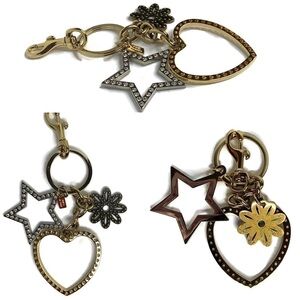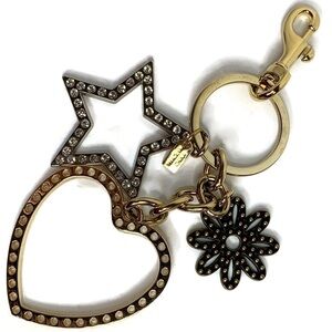 Form my collection—this is a long (huge fob) dangle heart mixed metal keychain. The design is just beautiful. I always add these clips to clips keychains onto my bag—I will leave on there for you. Unique and beautiful! Light scratching to back of metal and keychain possible from display.