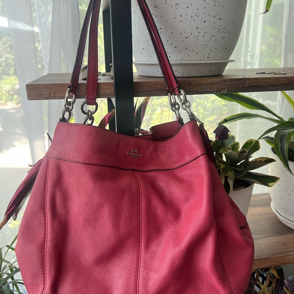 Stylish Coach shoulder bag in rich raspberry leather. Features sleek design and durable straps.