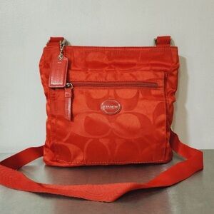 This Coach crossbody bag in a striking red hue combines style and practicality, featuring a signature monogram pattern and an adjustable strap for everyday convenience.