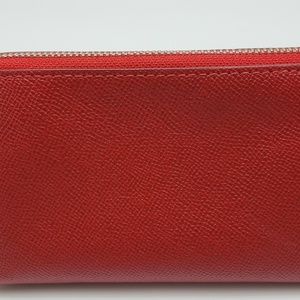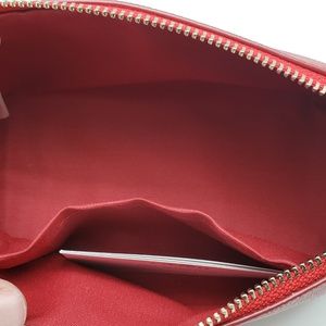Coach Red Crossgrain Leather Cosmetic Case F57857. Zips from bottom across to other side. Red fabric lining with one pocket. Retails for $75