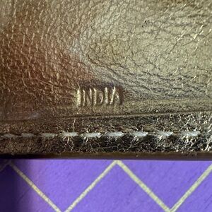 Elegant keychain photo holder featuring a logo red heart charm. Gold leather accents add a luxurious touch.