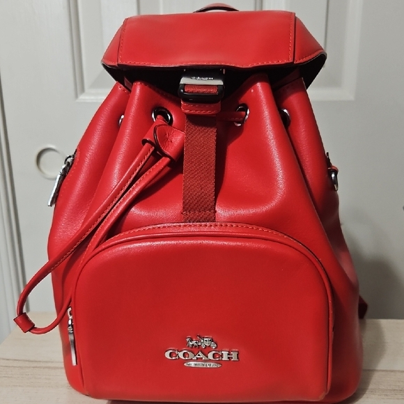 Sleek red leather backpack by Coach. Drawstring and flap closure. Front zip pocket with Coach logo. Adjustable shoulder straps. Polished silver-tone hardware.