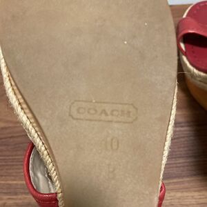 Coach Marian red leather wood platform wedge sandal. Open toe, adjustable ankle strap, 2 straps on vamp with gold tone buckles,padded leather insole and rubber. Jute strip detail around outsole.