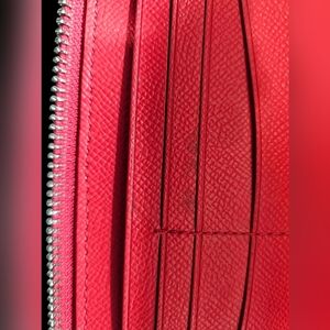 This stylish Coach wallet/wristlet in vibrant red leather is perfect for organizing your essentials. 16 card slots, 2 large pockets, and a zippered coin pocket! Its sleek design and premium quality make it a must-have accessory. This is vintage with the horse and buggy logo in excellent condition! Please see the pictures for the small sewing issue on one zipper and one small mark on the inside of the card slot.