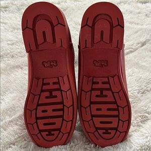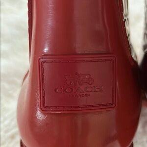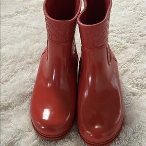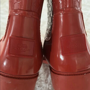 Step out in style with these Coach rain and snow boots, featuring a vibrant red hue and a subtle embossed pattern. Designed with a matte rubber finish, these boots ensure waterproof protection and a seamless construction for ultimate comfort. The chunky sole offers excellent traction, making them perfect for navigating wet and snowy conditions.