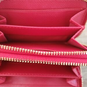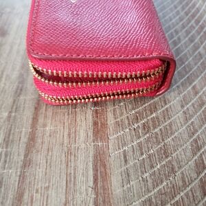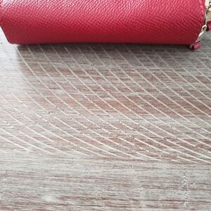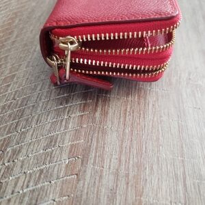 Elegant red Coach wallet. Features gold logo detail. Compact and stylish.
