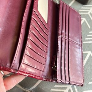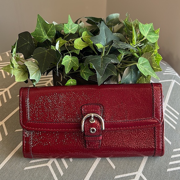 Elegant Coach wallet in rich red. Features a sleek buckle design. Perfect for any occasion.