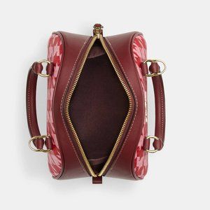 Stylish Coach satchel with a bold red and pink houndstooth pattern. Features sturdy handles and a classic design.