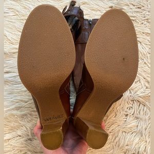These classic COACH leather and shearling boots are in mint condition and timeless. They were a gift, and I held on to them thinking that I could fit into them someday, but they never fit my calves. They measure 14” in circumference on the calf, and I sadly need another inch. They have never been worn. The heel height is 3” and the sole and heel are made of really grippy rubber, so they would be great even in winter weather. The leather is so soft and buttery- just the kind of quality that Coach promises will last and wear beautifully.