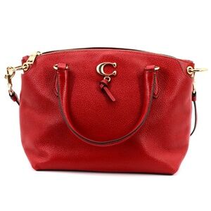 Red Coach Remi satchel, 1317 model, made of soft pebbled leather with gold-tone hardware. This satchel features a top zip closure, a fabric lining, and multiple compartments for organization. It has handles with a 4.75-inch drop and may come with a detachable crossbody strap for versatile carrying options. The exterior is accented with the Coach "C" logo.