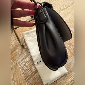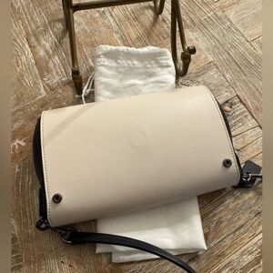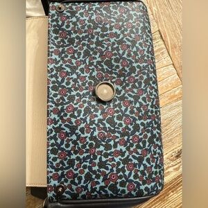 This bag is reversible. The body is done in coated canvas with a floral design in lt. blue, navy, green and dark red. The reversible flap is done in leather and goes from a midnight blue to ivory, with snap closures. The flap has a magnetic snap closure. The inside is fabric lined with a zip pocket and a multifunction pocket. There is a removable cross body strap which is 21 1/2". The bag is 9" x 5 1/4" x 2 3/4". Brand new without tags !