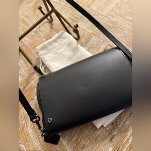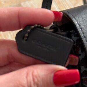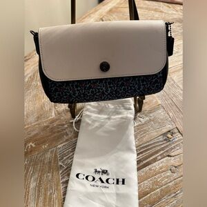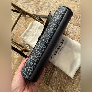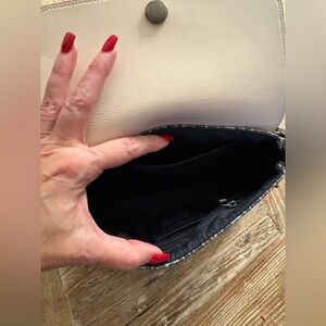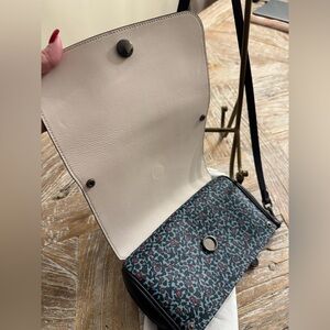 This bag is reversible. The body is done in coated canvas with a floral design in lt. blue, navy, green and dark red. The reversible flap is done in leather and goes from a midnight blue to ivory, with snap closures. The flap has a magnetic snap closure. The inside is fabric lined with a zip pocket and a multifunction pocket. There is a removable cross body strap which is 21 1/2". The bag is 9" x 5 1/4" x 2 3/4". Brand new without tags !