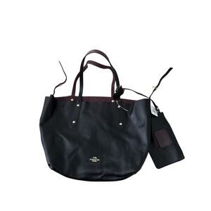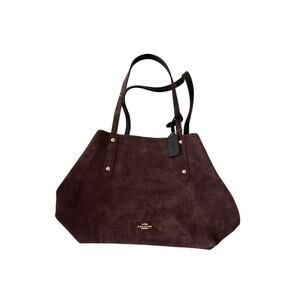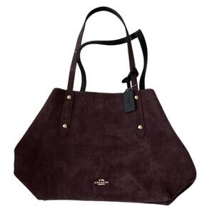 Sold out everywhere — Coach Reversible Large Market Tote in brown suede with black crossgrain leather reverse. It's essentially two bags for the price of one. New with tags, never used. Includes removable wallet insert and two Coach hangtags. Dual shoulder straps, open top, spacious interior, and versatile reversible construction for two looks in one. Comes with original Coach dust bag. Condition: pristine, new with tags.